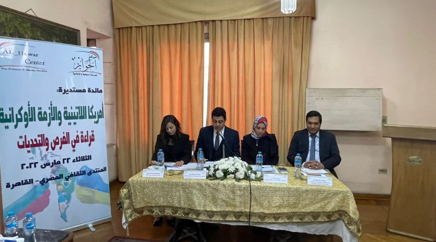 نظم مركز الحوار للدراسات السياسية والإعلامية، ندوة بعنوان: “أمريكا اللاتينية والأزمة الأوكرانية: قراءة فى الفرص والتحديات”، وذلك بالمنتدى الثقافى المصرى بالقاهرة. شارك فى الندوة، سفير الارجنتين بالقاهرة – إدواردو فاريلا، وسفير فنزويلا – ويلمر بارينتوس، بالإضافة إلى ممثل...