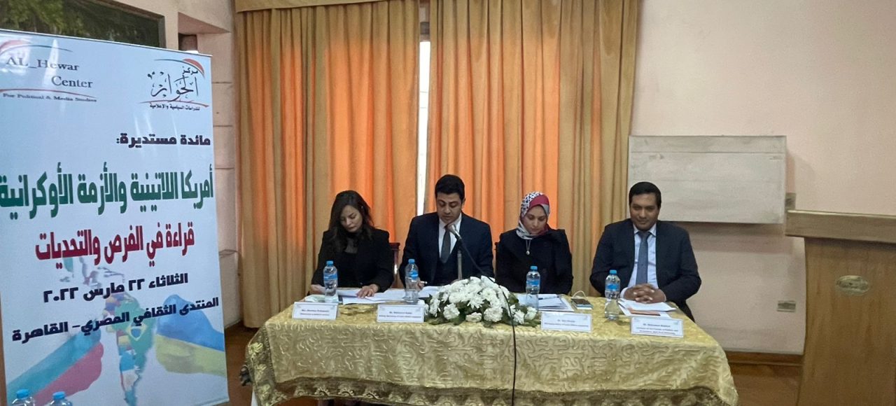 نظم مركز الحوار للدراسات السياسية والإعلامية، ندوة بعنوان: “أمريكا اللاتينية والأزمة الأوكرانية: قراءة فى الفرص والتحديات”، وذلك بالمنتدى الثقافى المصرى بالقاهرة. شارك فى الندوة، سفير الارجنتين بالقاهرة – إدواردو فاريلا، وسفير فنزويلا – ويلمر بارينتوس، بالإضافة إلى ممثل عن سفارة البرازيل، فضلًا عن مشاركة الباحثين،...Read More